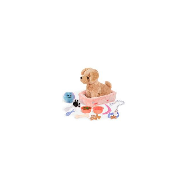 Duży zestaw akcesoriów dla pieska - z miękkim, wygodnym legowiskiem i niezbędnymi akcesoriami, które przydadzą się podczas codziennej opieki nad pieskiem - szczeniaczkiem i kreatywnej zabawy lalkami z serii Our Generation.