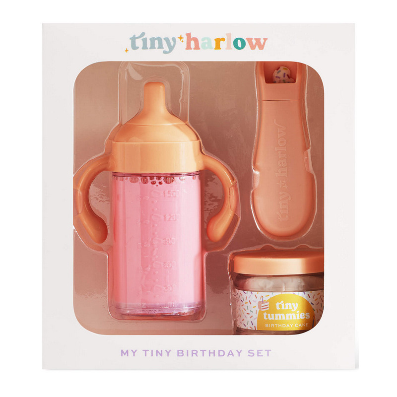 ZESTAW URODZINOWY magiczny kubek i słoiczek z jedzeniem i łyżeczką do karmienia lalek Tiny Harlow 3+