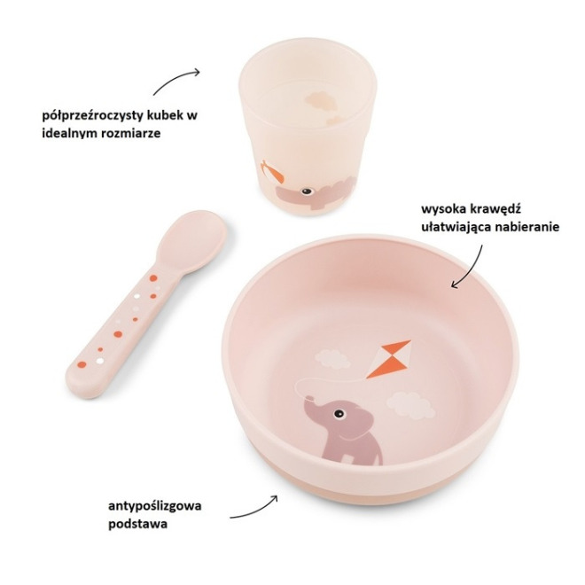 Zestaw zawiera miseczkę, półprzezroczysty kubeczek i łyżeczkę do karmienia, wszystko w uroczych pudrowych odcieniach.