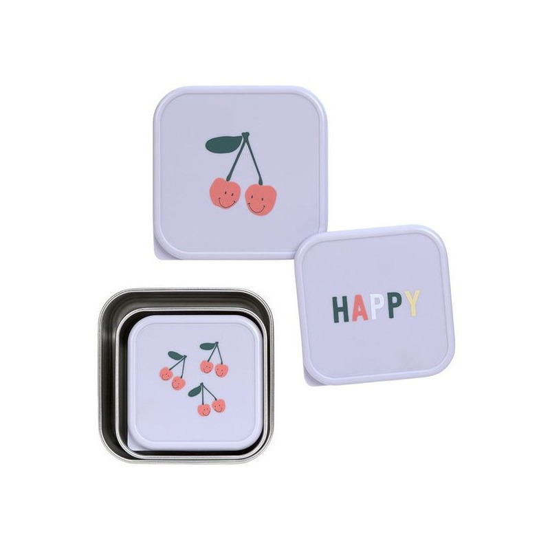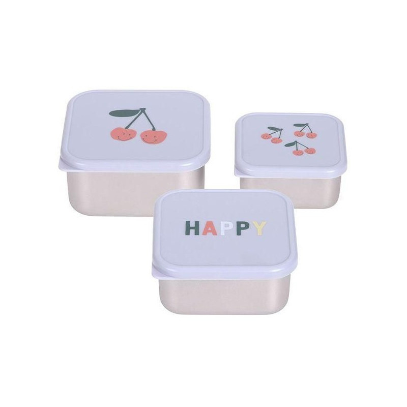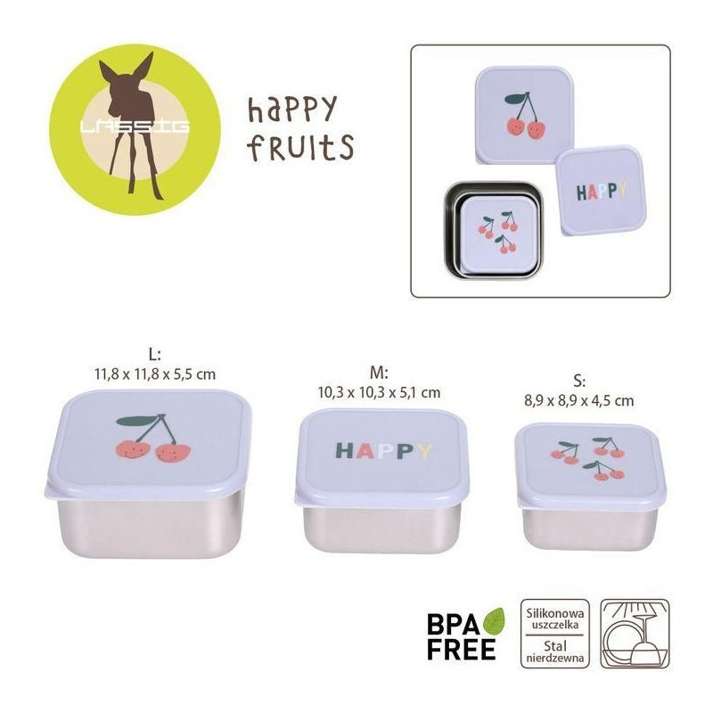 Komplet trzech pojemników na przekąski – snackbox'ów marki LASSIG, wykonanych ze stali nierdzewnej z pokrywkami z wysokiej jakości polipropylenu. Są funkcjonalne, lekkie, pojemne i mają kwadratowy kształt. Pudełeczka są w trzech poręcznych wielkościach: S, M oraz L. Idealne do przechowywania i przenoszenia przekąsek lub posiłków w porcjach, odpowiednich dla dziecka. Można je włożyć jeden w drugi, dzięki czemu zajmują mało miejsca. Boxy są srebrne, a ich pokrywki – jasnoniebieskie z motywem uśmiechniętych wisienek i napisem HAPPY.