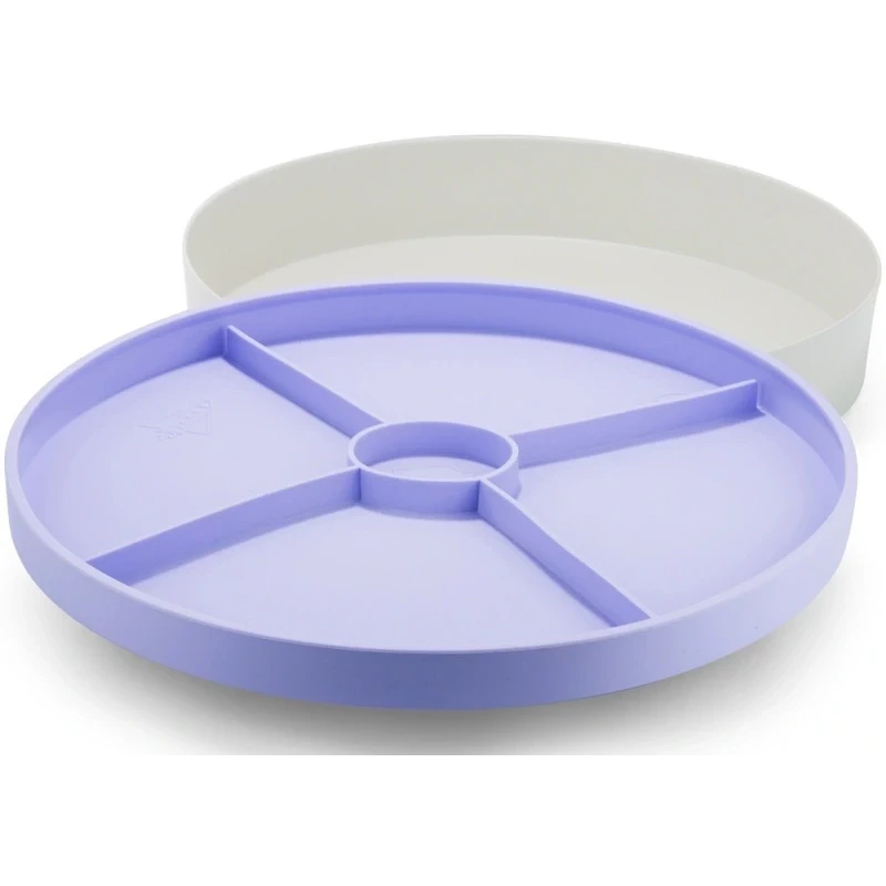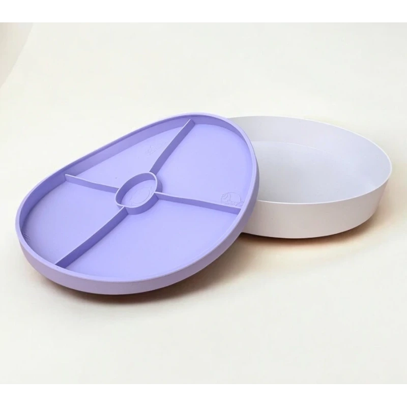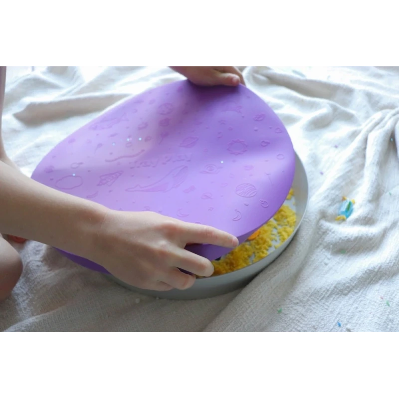 🔹 Górna tacka – wykonana z miękkiego, przyjemnego w dotyku silikonu z tłoczonymi wzorami i przegródkami. Doskonała do sortowania, odbijania kształtów w ciastolinie, eksploracji dotykowej oraz jako talerz na przekąski.