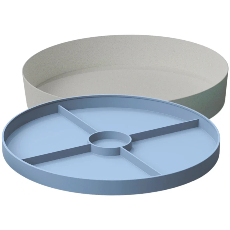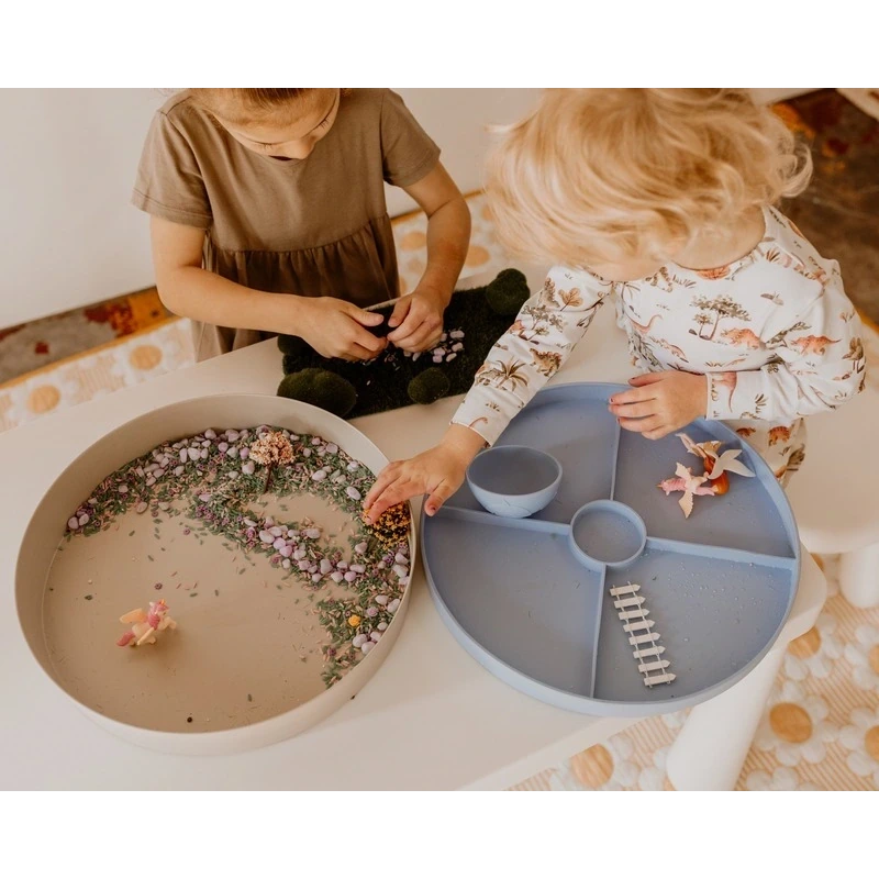 🔹 Górna tacka – wykonana z miękkiego, przyjemnego w dotyku silikonu z tłoczonymi wzorami i przegródkami. Doskonała do sortowania, odbijania kształtów w ciastolinie, eksploracji dotykowej oraz jako talerz na przekąski.