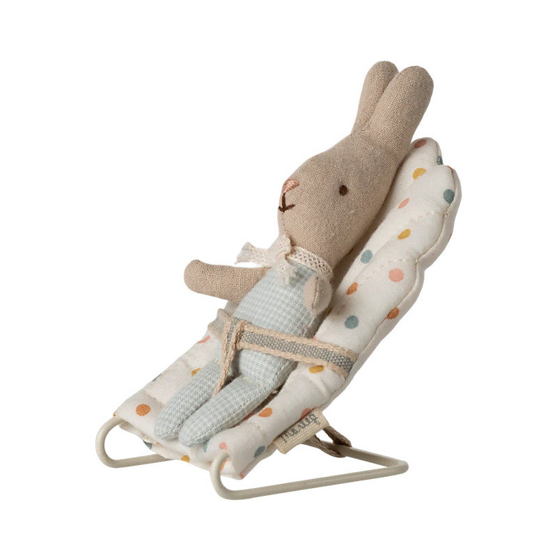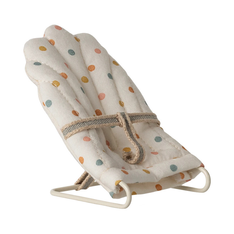 Leżaczek pomoże w usypianiu małych myszek Maileg - doskonały dodatek do zabawy w dom. Podstawa wykonana z metalu, pokryta jest materiałem w kropeczki.