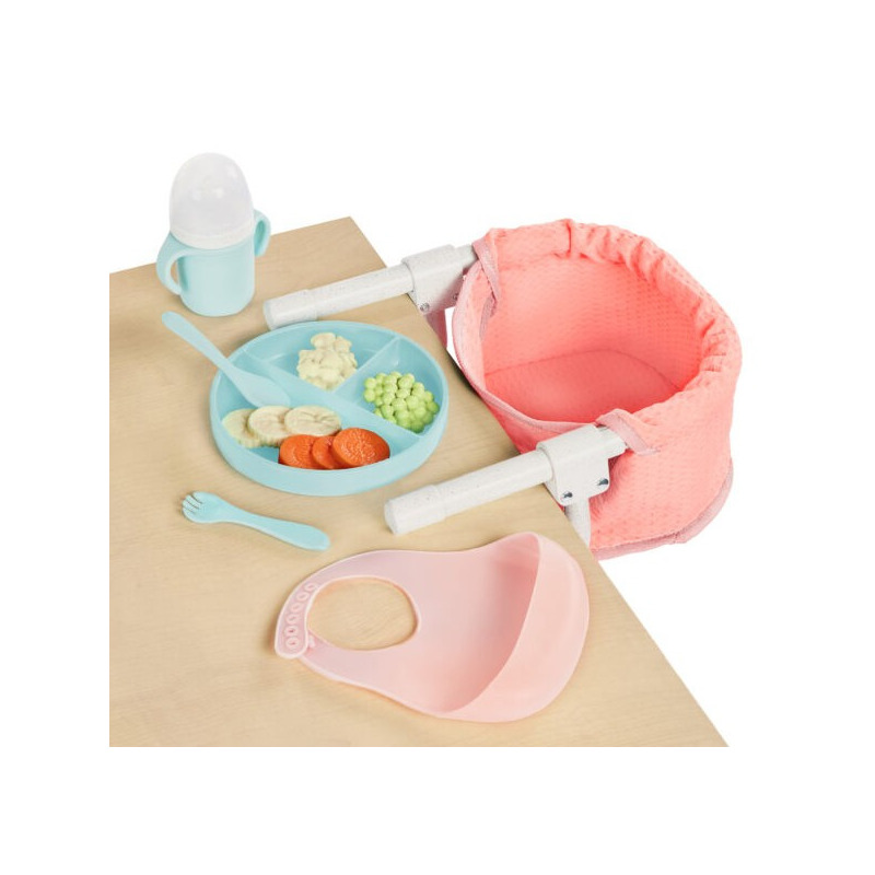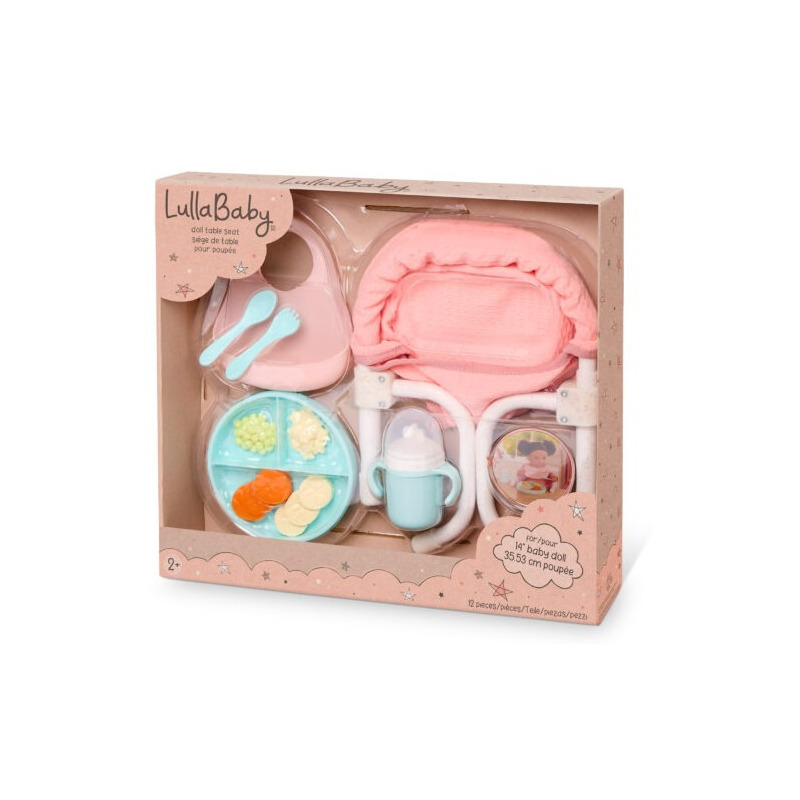 ZESTAW DO KARMIENIA lalki niemowlaka z z FOTELIKIEM przypinanym do blatu i akcesoriami LullaBaby 2+