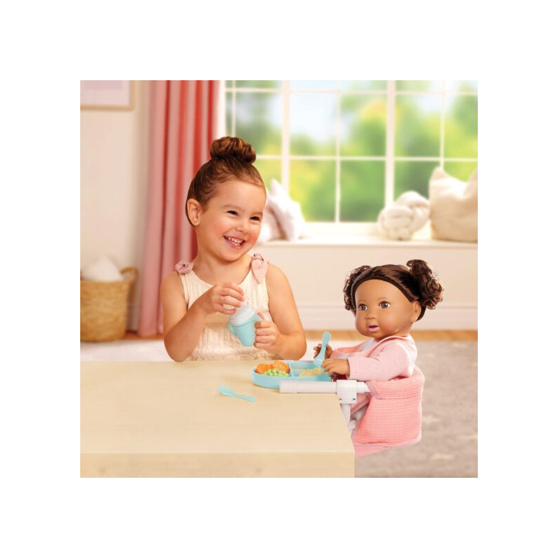 Całość idealna do uwielbianej przez dzieci zabawy w odgrywanie ról i naśladowanie czynności wykonywanych w realnym życiu – kiedy lalka jest głodna, wystarczy posadzić ją wygodnie i bezpiecznie w krzesełku, aby mogła cieszyć się pysznymi posiłkami, co równocześnie ćwiczy małą motorykę i umiejętności społeczne.