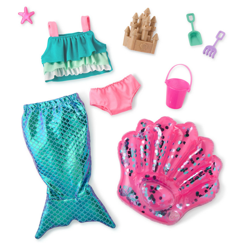 Śliczny syreni strój i akcesoria dla lalki o wysokości 46 cm z serii OurGeneration sprawdzi się w czasie wakacyjnych wyjazdów i wypoczynku nad wodą.