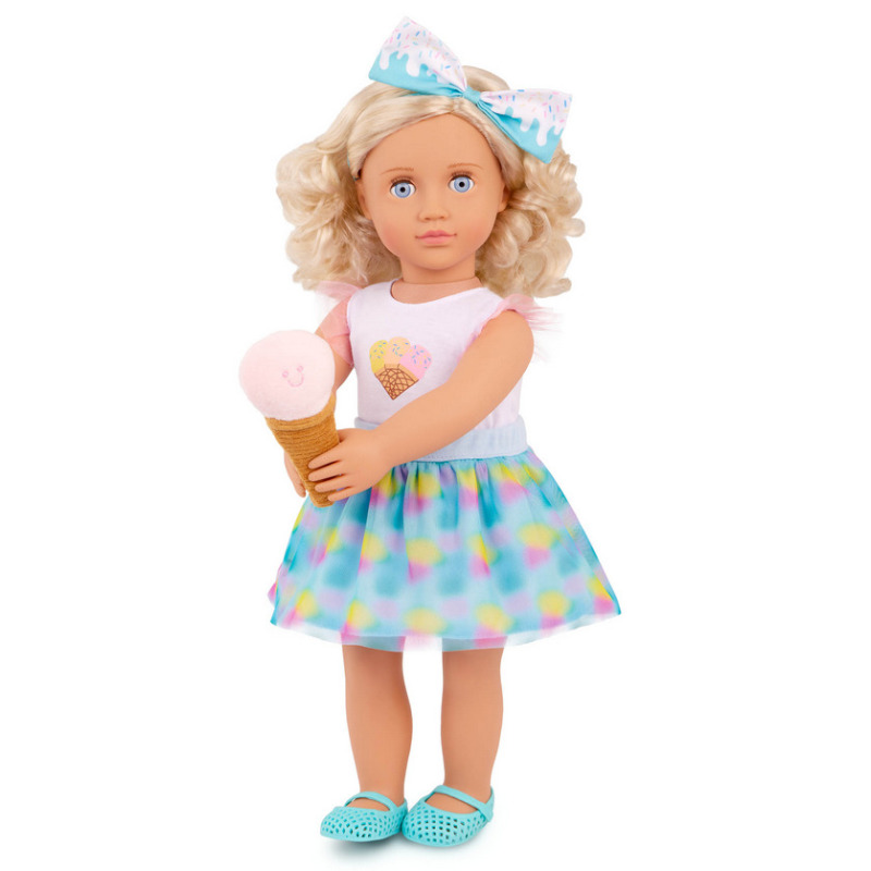 Strój dla lalki w słodkich odcieniach to niezbędny element garderoby. Stylizacja dla miłośników letnich przysmaków! Lody, lody dla ochłody! W zestawie znajduje się również maskotka - lodowy rożek. Zestaw przeznaczony dla lalek o wysokości 46 cm z serii Our Generation.