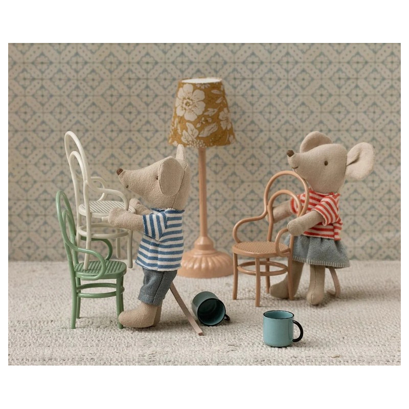 Metalowe, białe krzesełko w stylu retro to obowiązkowe wyposażenie w każdym mysim domu. Rozmiar krzesła idealnie pasuje dla rozmiaru myszki little sister/big sister lub little brother/big brother. Ten mebel idealnie dostosuje się do każdego pomieszczenia mysiego domku.