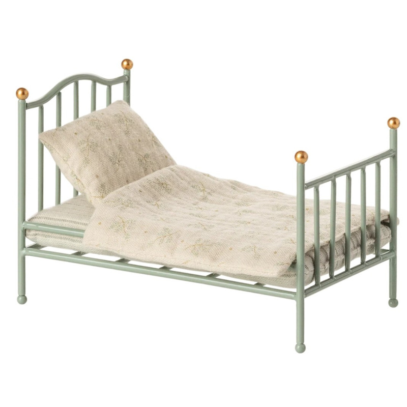 MINIATUROWE ŁÓŻKO Z POŚCIELĄ metalowe miętowe vintage akcesoria dla myszek i lalek Mint Maileg 3+
