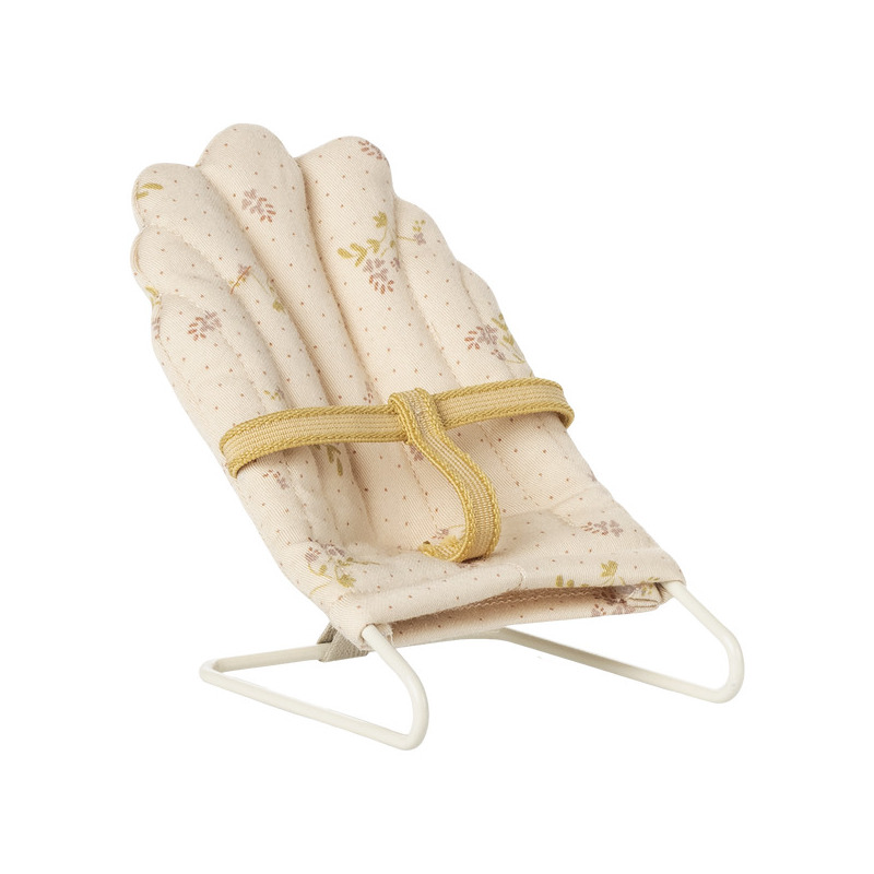 Leżaczek pomoże w usypianiu małych myszek Maileg. To doskonały dodatek do zabawy w dom. Podstawa wykonana z metalu, pokryta jest materiałem o pięknym wzorze.