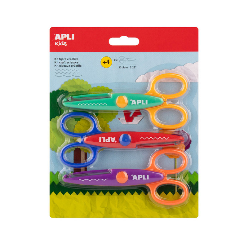 Zestaw zawiera trzy pary nożyczek, z których każde tną w unikalnym kształcie: zakrzywionym, ząbkowanym i zygzakowatym. Idealne zarówno do użytku szkolnego, jak i domowego aby dodać unikalny akcent do wszystkich kreatywnych projektów!