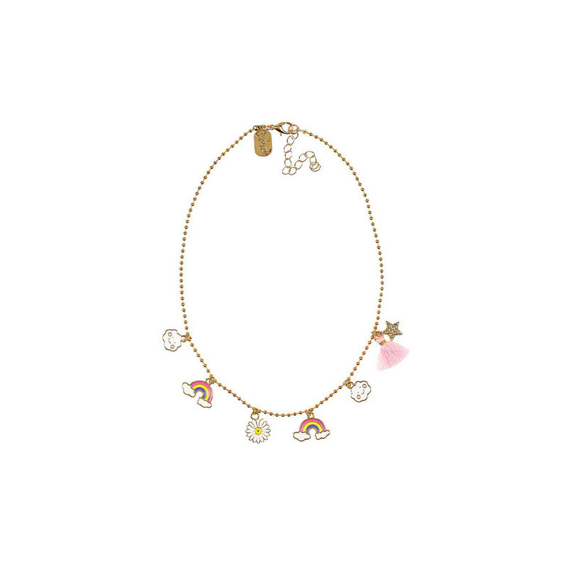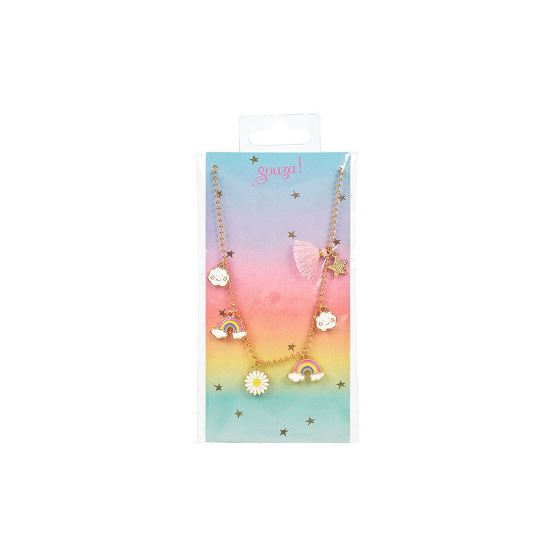 Złoty naszyjnik z zawieszkami Niebo holenderskiej marki Souza! To ozdobny łańcuszek z małych kuleczek z 6 ozdobnymi zawieszkami w kształcie: tęczy, uśmiechniętych chmurek i kwiatka oraz z ozdobnym różowym chwostem z małą gwiazdką.
