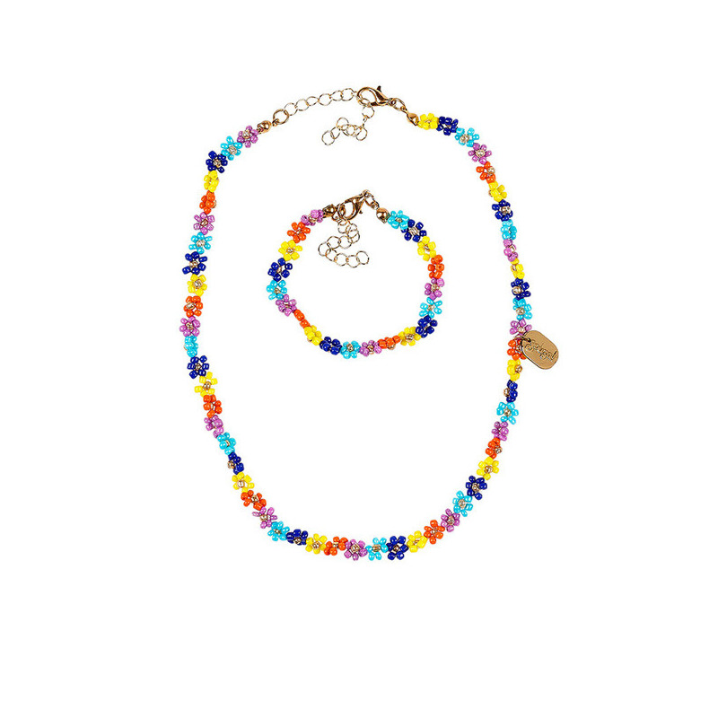 Zestaw biżuterii z kolorowych koralikowych kwiatków będzie idealny zarówno na przyjęcia, jak i do noszenia na co dzień. Sprawdzi się także jako stylowy prezent.