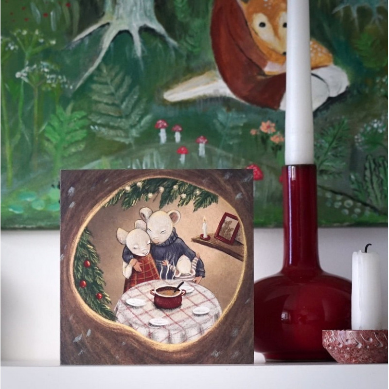 Kartka świąteczna przywołująca najmilsze wspomnienia świąteczne. Mysia rodzina przy wigilijnym stole. Czy jest coś piękniejszego od tradycyjnej kartki wyciągniętej ze skrzynki pocztowej? Warto zadbać o taki drobny, choć piękny gest w dobie internetu i składania życzeń za pomocą sms-ów.