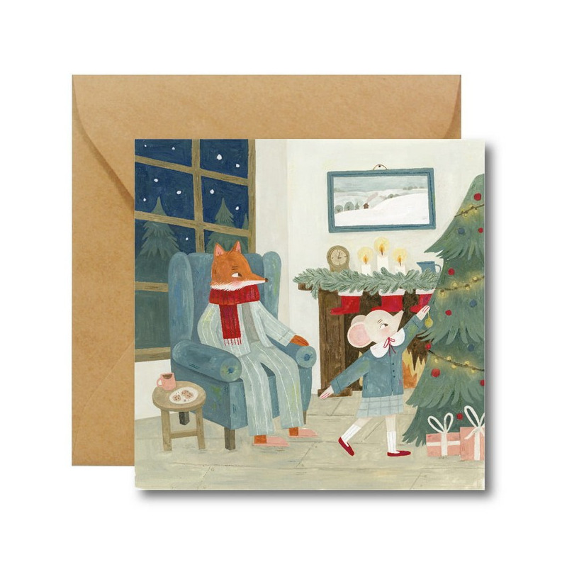 Kartka świąteczna przywołująca najmilsze wspomnienia świąteczne. Uroczy motyw wnętrza świątecznego domu, z liskiem i króliczkiem. Czy jest coś piękniejszego od tradycyjnej kartki wyciągniętej ze skrzynki pocztowej? Warto zadbać o taki drobny, choć piękny gest w dobie internetu i składania życzeń za pomocą sms-ów.
