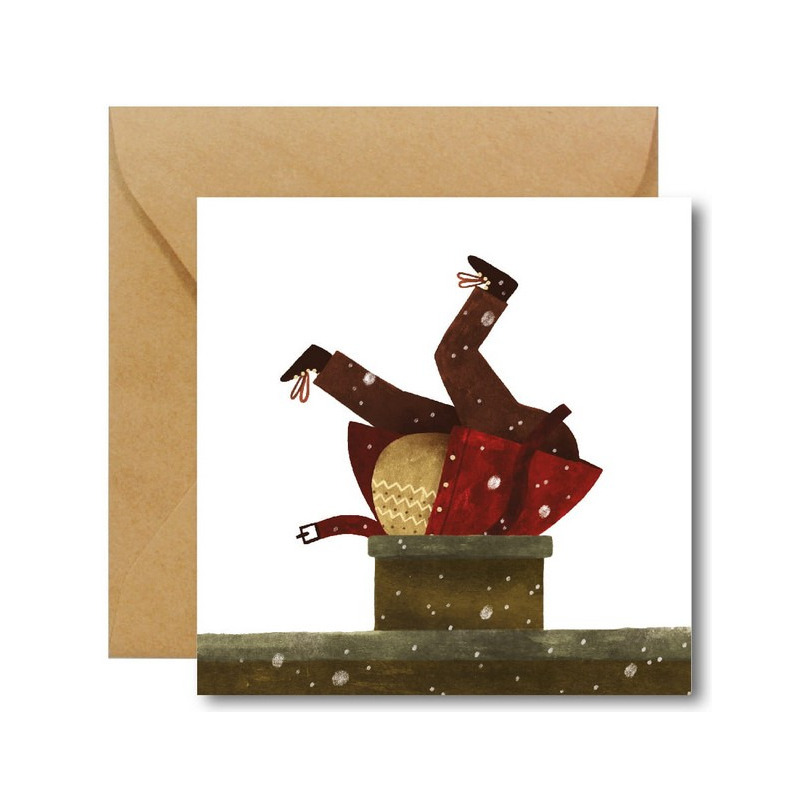 Kartka świąteczna przywołująca najmilsze wspomnienia świąteczne. Mikołaj przeciskający się przez komin. Czy jest coś piękniejszego od tradycyjnej kartki wyciągniętej ze skrzynki pocztowej? Warto zadbać o taki drobny, choć piękny gest w dobie internetu i składania życzeń za pomocą sms-ów.