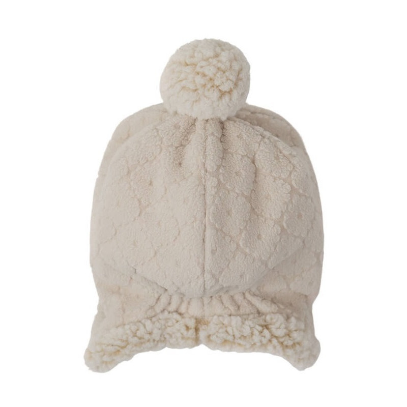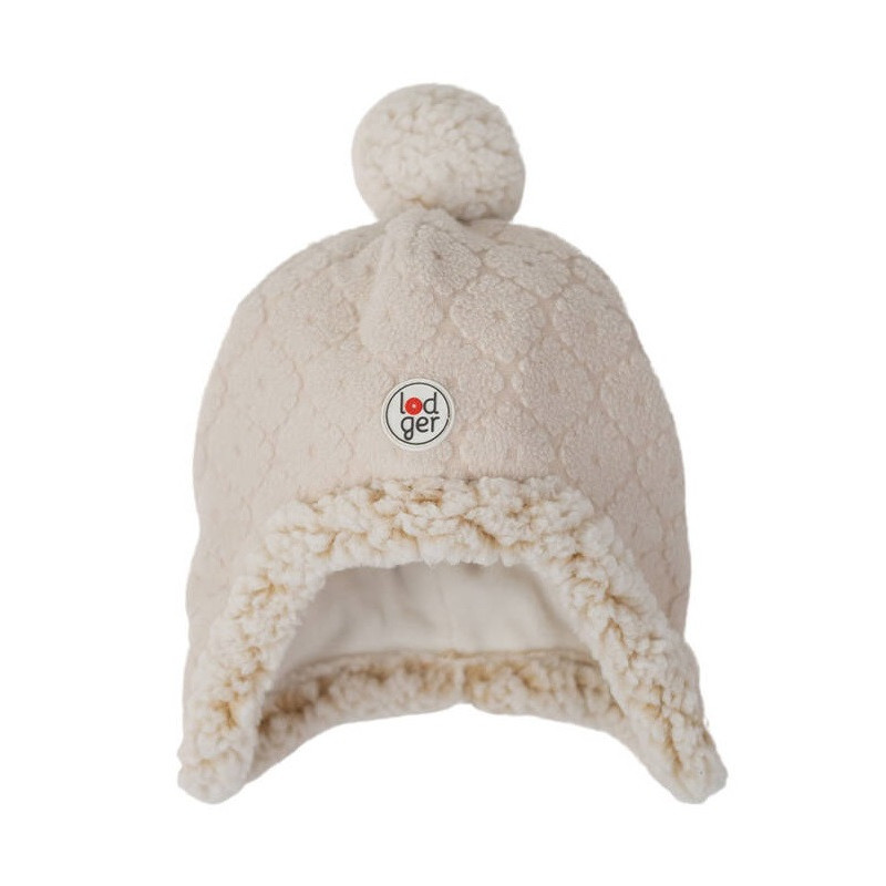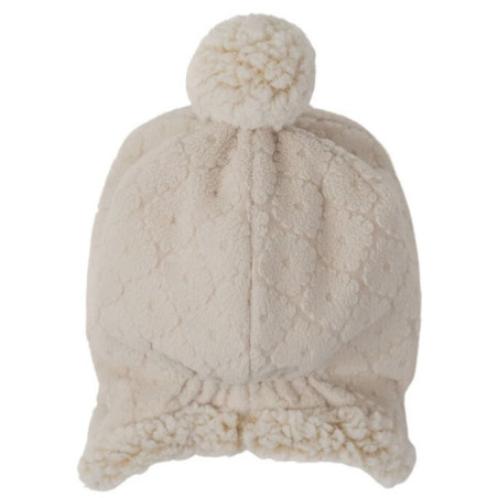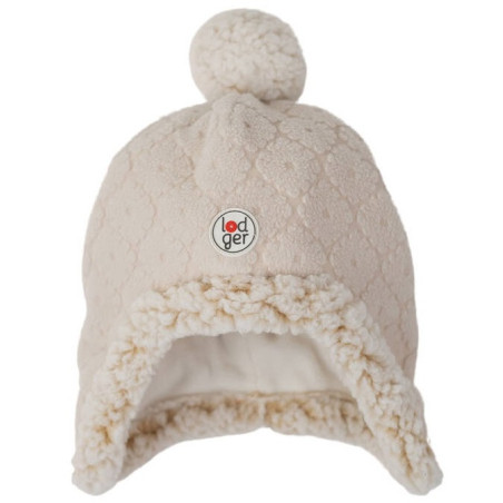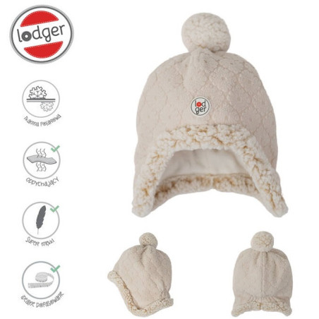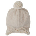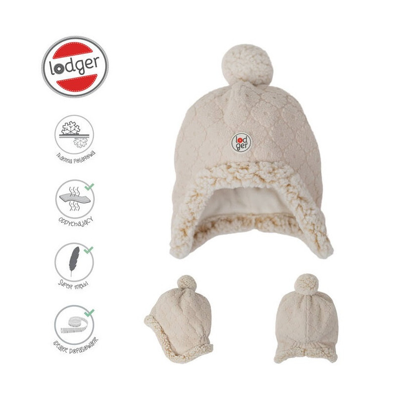 Zewnętrzna strona czapki ma jasny beżowy kolor, a podszewka i futerkowe detale – barwę off-white.