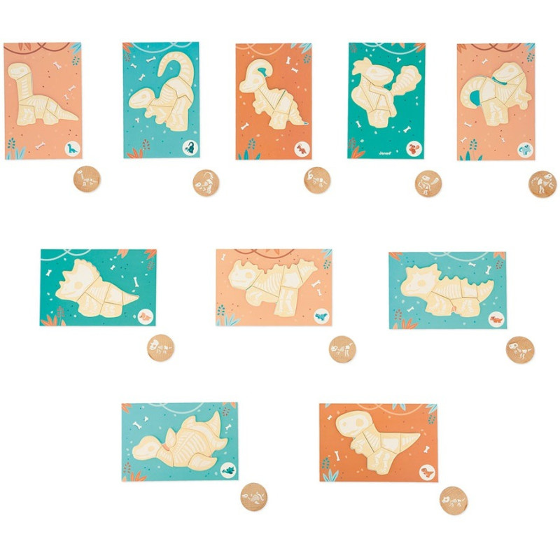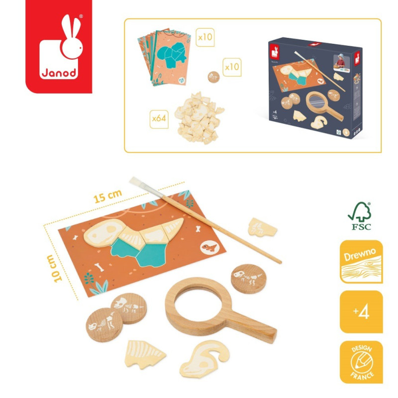 - 64 drewniane fragmenty szkieletów, 10 żetonów ze szkieletami dinozaurów