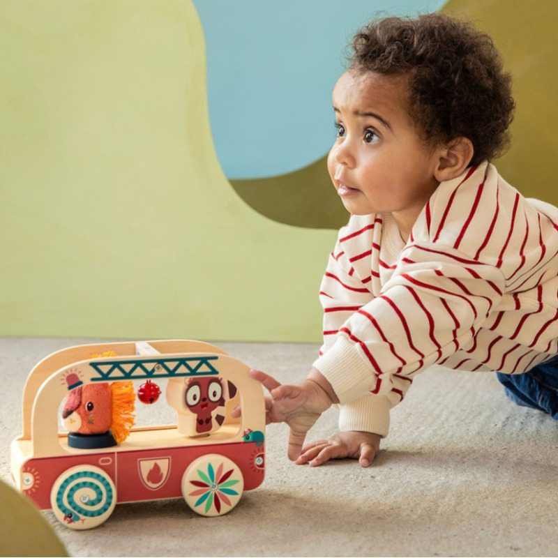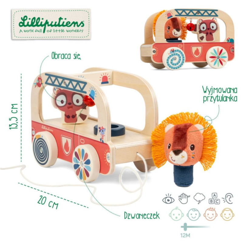 Drewniany pojazd do ciągnięcia z kolekcji Lew Jack belgijskiej marki Lilliputiens to niebanalna zabawka, która wspiera dziecko w rozwoju ruchowym i pobudza wyobraźnię. Kolorowy wóz strażacki ma obłe kształty, jest otwarty i przewozi dwóch wyjątkowych pasażerów: drewnianego Lemura Elvisa, który obraca się podczas jazdy i uderza w dzwoneczek, oraz pluszowego Lwa Jacka, którego można wyciągać i wkładać na miejsce kierowcy. Pojazd jest łatwy do prowadzenia – można go ciągnąć na sznureczku (z możliwością odczepienia) lub pchać. Dodatkowo kółka wozu tworzą ciekawe efekty wizualne w ruchu.