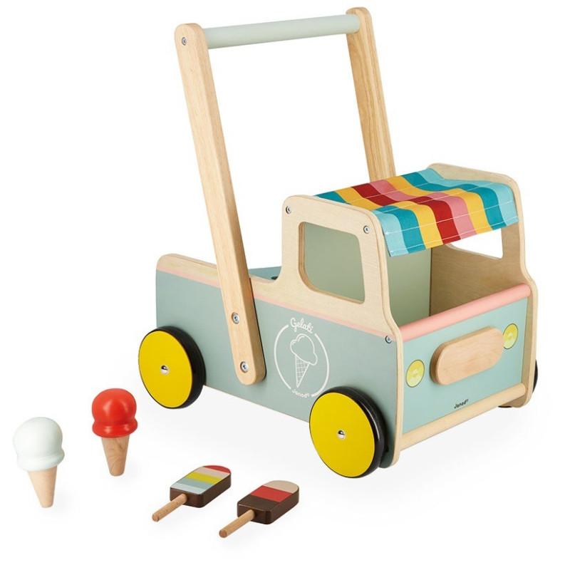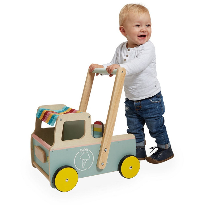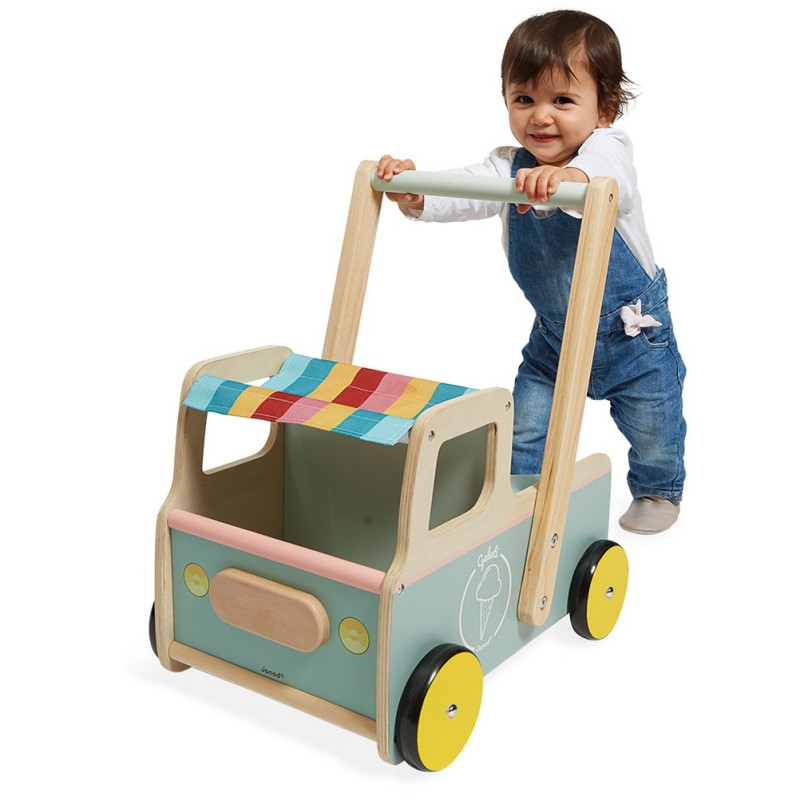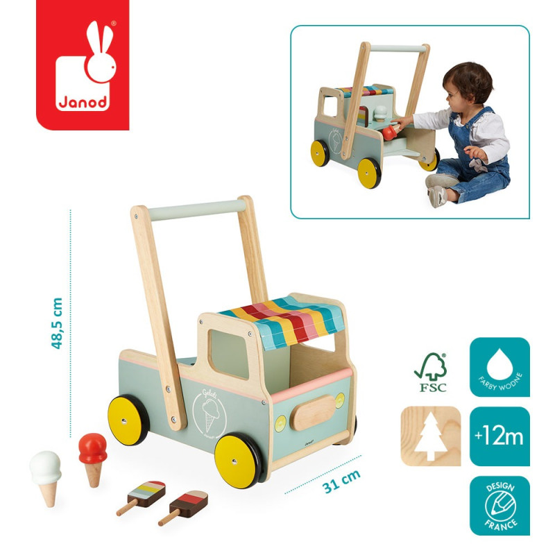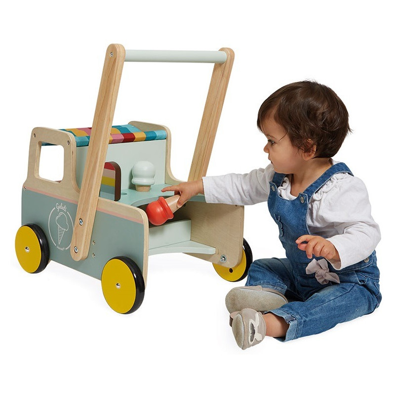 Drewniany pchacz Furgonetka z lodami wspiera dziecko w stawianiu