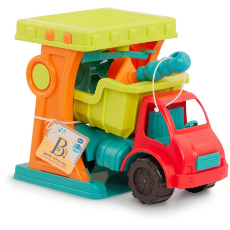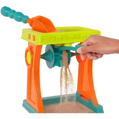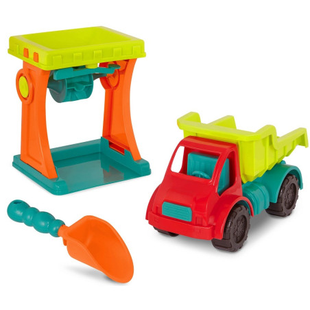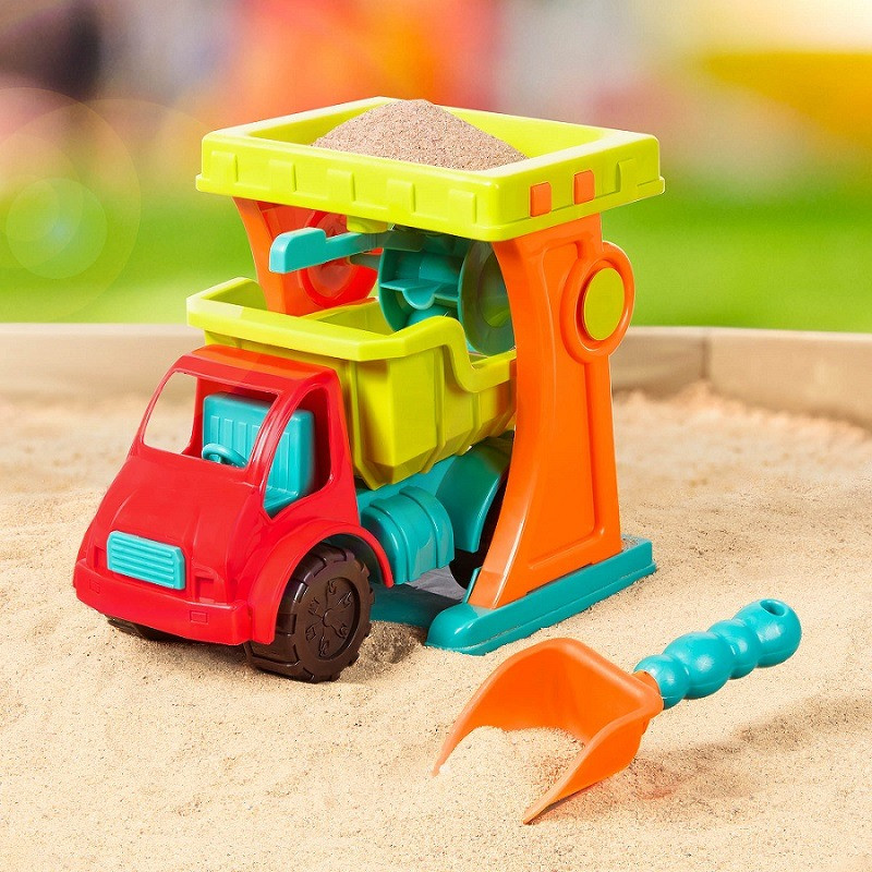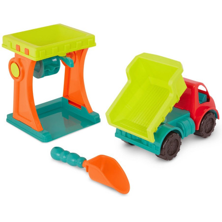 Znajduje się w nim ciężarówka-wywrotka, młyn do piasku,