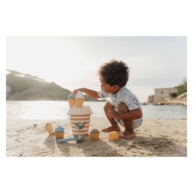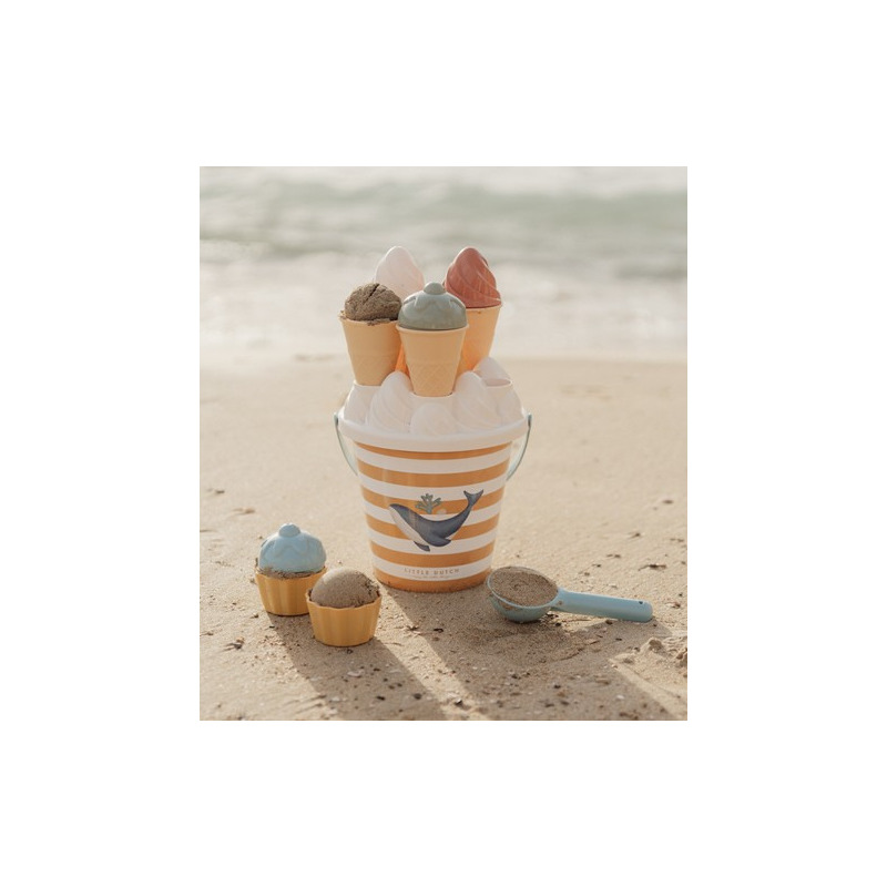 Zrób najsmaczniejsze lody z piasku dzięki temu uroczemu zestawowi plażowemu. Ten 14-częściowy zestaw zabawek do piasku składa się z wiaderka i foremek w kształcie lodów, do zestawu dołączona jest również łopatka w kształcie łyżki do lodów. Zestaw zawiera również sitko oraz zabawne akcesoria do serwowania piaskowych lodów w wafelku lub w miseczkach.