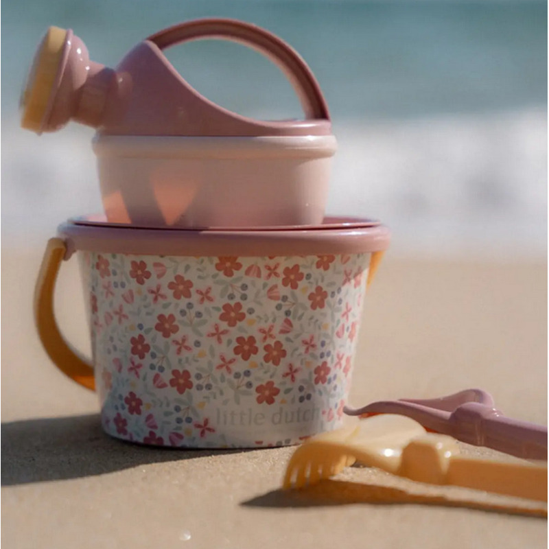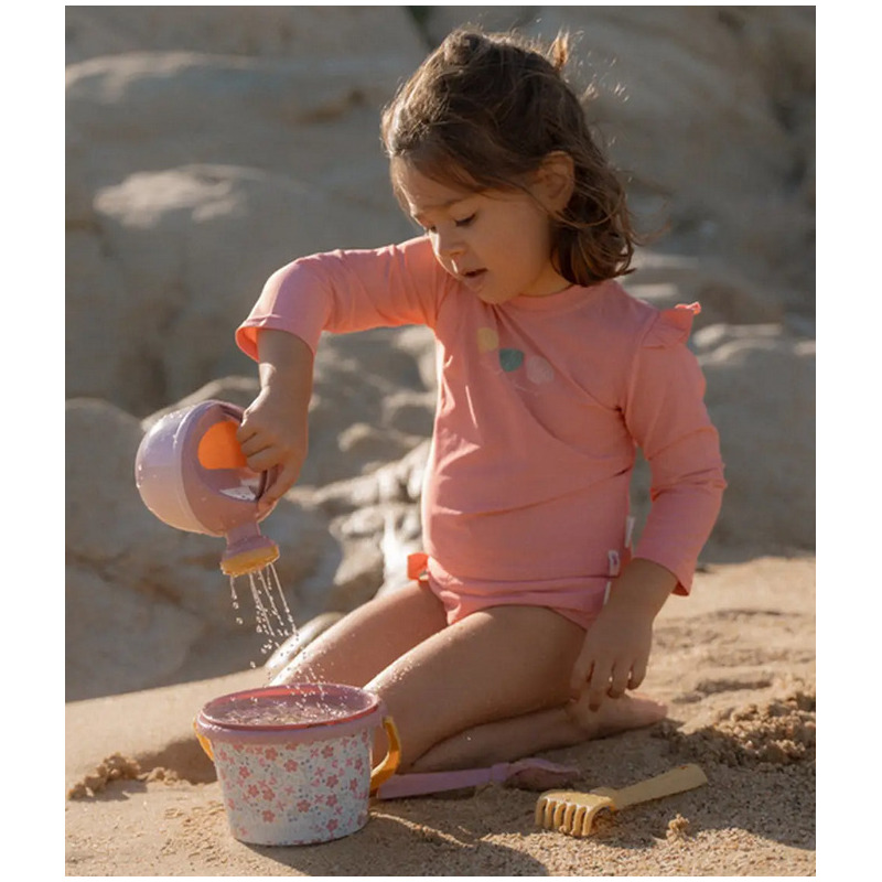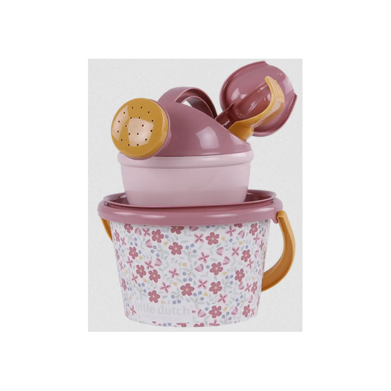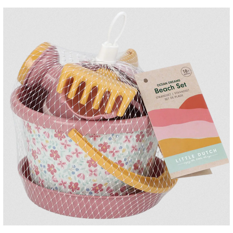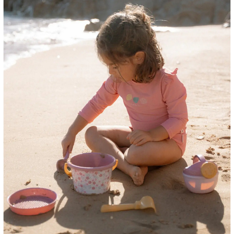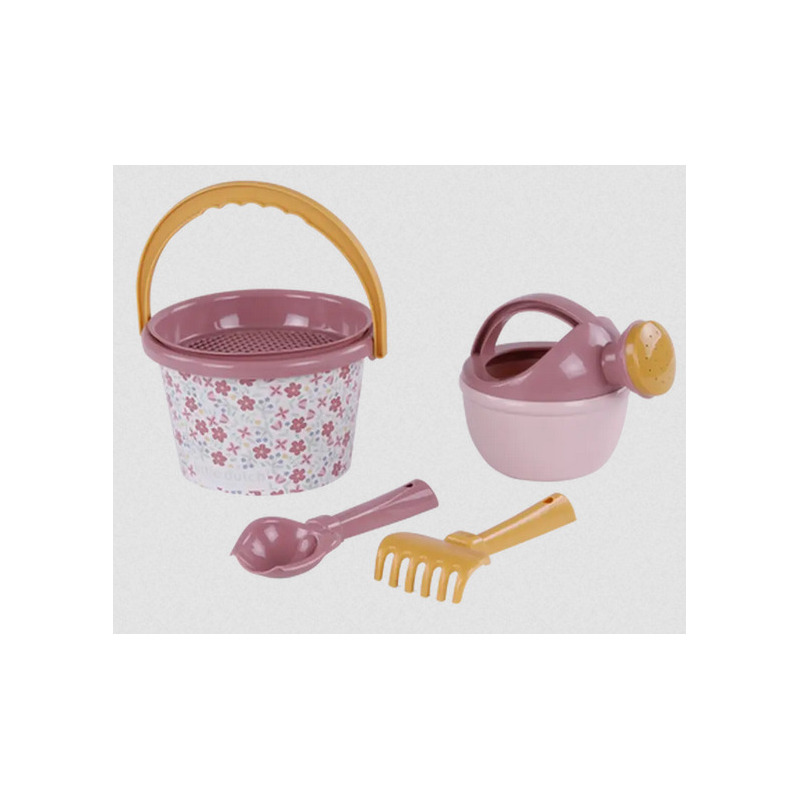 Ten zestaw zawiera wszystkie niezbędne akcesoria, których Twoje dziecko będzie potrzebowało na plaży lub w piaskownicy: wiaderko, konewkę, łopatkę, grabki i sitko. Wykonany w różowej kolorystyce z kwiatowym wzorem. Doskonała zabawa w wodzie i na plaży!