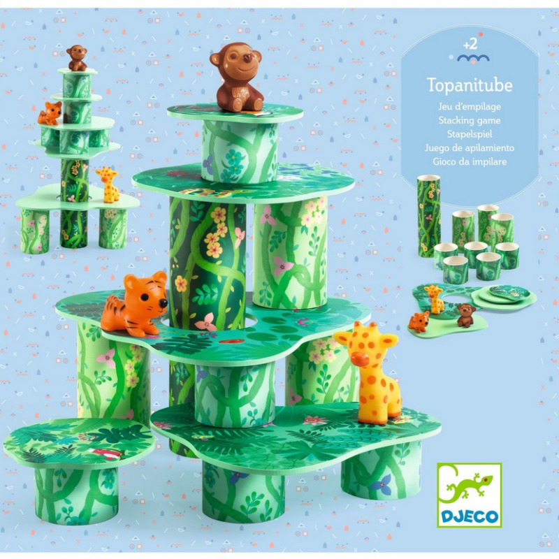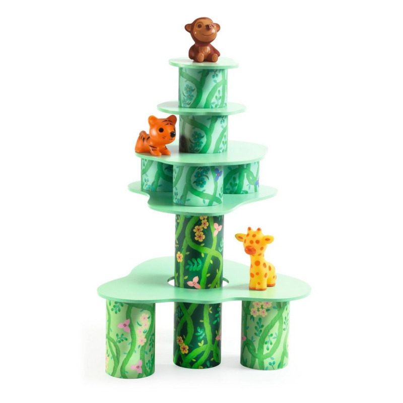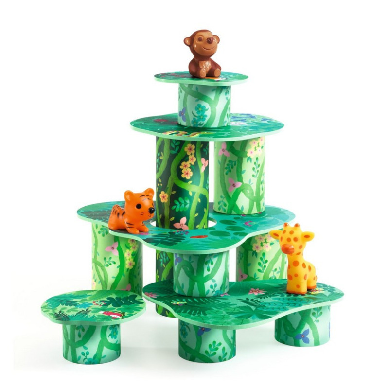 Zestaw elementów konstrukcyjnych zawierający 9 kartonowych tubek i 5 drewnianych plansz, ilustrowanych motywem dżungli. Z podanych części można tworzyć przeróżne konstrukcje w kształcie wież. Na tym zabawa się nie kończy, ponieważ do zestawu dołączone są również figurki zwierząt. Ułożone budowle mogą służyć jako wybieg w zoo lub las tropikalny.