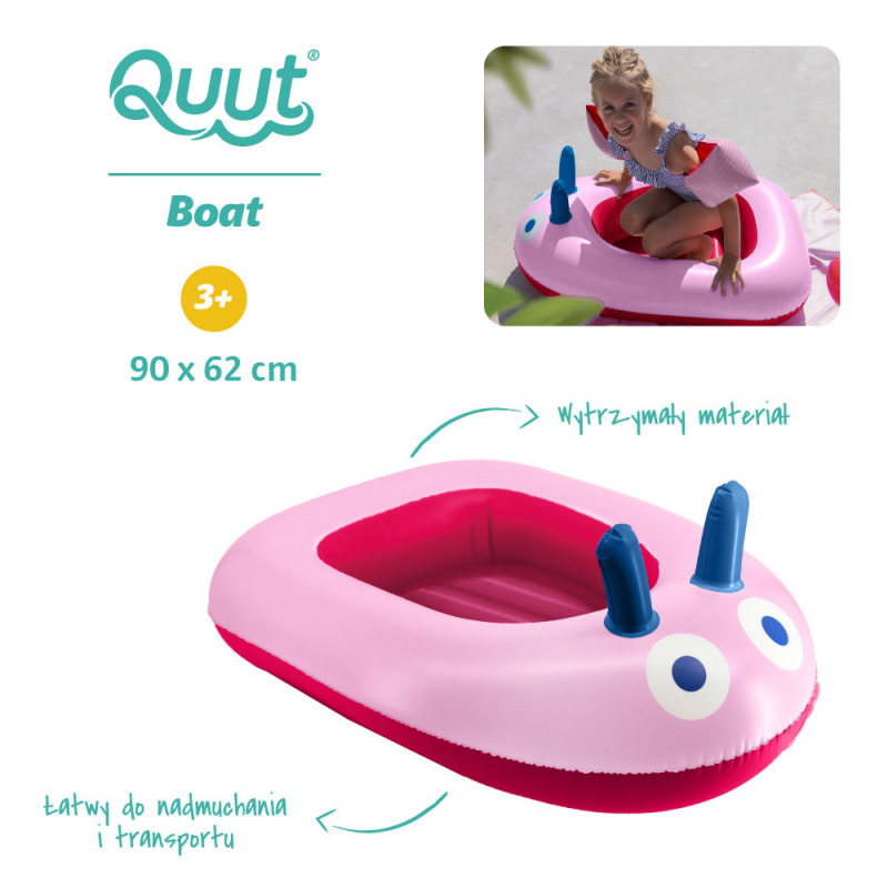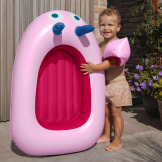Ponton jest stabilny, ma grube brzegi, antypoślizgowe dno i intensywne kolory: ciemno- i jasnoróżowy, ozdobione dużymi granatowymi oczami i wąsikami, które maluch może trzymać podczas dryfowania.