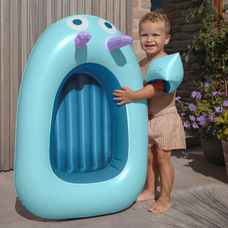 Ponton jest stabilny, ma grube brzegi, antypoślizgowe dno i intensywne kolory: ciemno- i jasnoniebieski z dużymi oczami i lawendowymi czółkami, które maluch może trzymać podczas dryfowania.