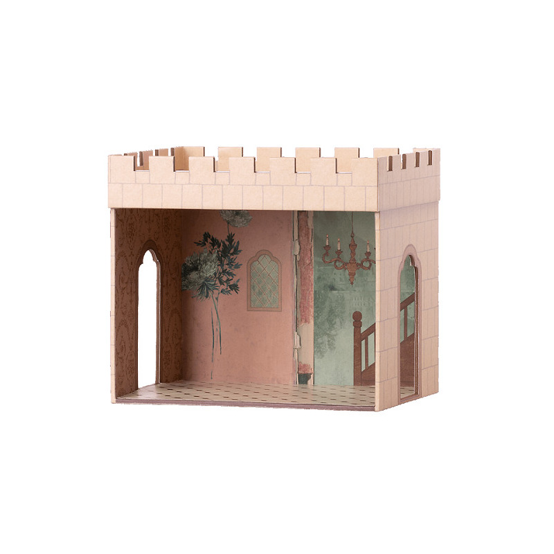 Wyjątkowa tekturowa sala zamkowa idealna dla myszek Maileg. Wystarczy w niej umieścić mebelki, akcesoria i można zacząć zabawę. Sala ta jest pusta i tylko od wyobraźni dziecka zależy, w jaki sposób zostanie zaaranżowana. Świetnie sprawdzi się zarówno jako sypialnia, salon czy jadalnia.