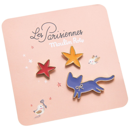 ZESTAW ZAWIERA: 3 przypinki: 2 gwiazdki i kotek