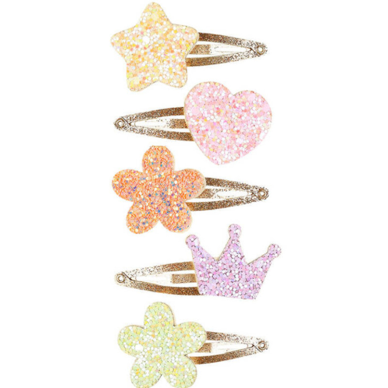 Komplet pięciu spinek do włosów Carolina marki Souza! Na każdej z nich znajduje się inna brokatowa aplikacja: korona, 2 x kwiatek, serce i gwiazda.