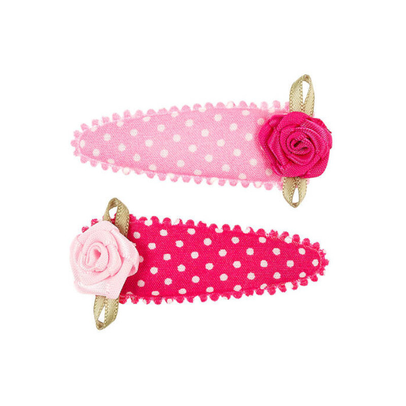 Spinki do włosów Shanne marki Souza są obciągnięte różową tkaniną w groszki i ozdobione uroczymi różyczkami. Zaciski na klik sprawiają, że ozdoby stabilnie trzymają się włosów.