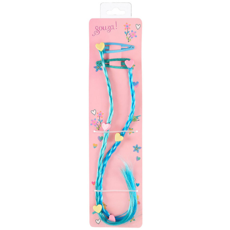 Komplet spinek do włosów Ulla marki Souza zawiera dwa doczepiane warkoczyki: mają niebieski kolor (jaśniejszy i ciemniejszy), a na każdym z nich znajdują się jasnoróżowe i żółte aplikacje-serduszka.