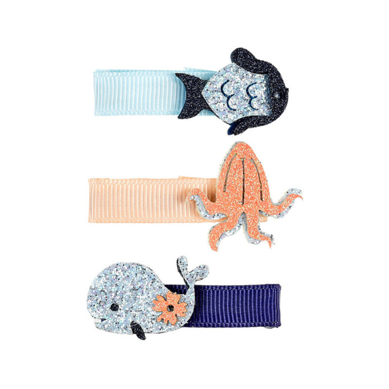 Komplet trzech spinek do włosów ze zwierzątkami morskimi Rifka marki Souza! Na każdej z nich znajduje się inna brokatowa aplikacja: rybka, kalmar oraz wieloryb. Metalowa część spinek pokryta jest materiałem (rypsową wstążką).