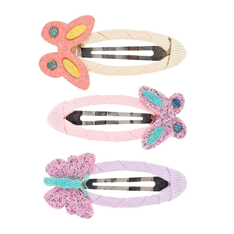 Komplet trzech spinek do włosów z brokatowymi motylami Xeni marki Souza! Na każdej z nich znajduje się brokatowa aplikacja – motylek. Metalowa część obciągnięta jest wokół materiałem.
