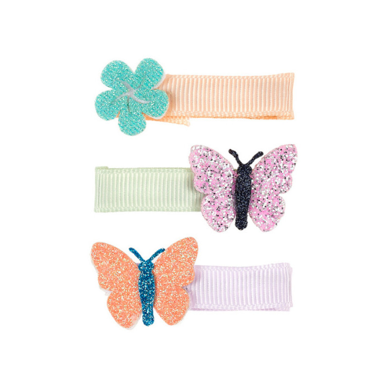 Komplet trzech spinek do włosów z motylami Yke marki Souza! Na każdej z nich znajduje się inna brokatowa aplikacja – są to dwa motyle (brzoskwiniowy oraz liliowy) i kwiatek (turkusowy). Metalowa część spinek pokryta jest materiałem (rypsową wstążką).