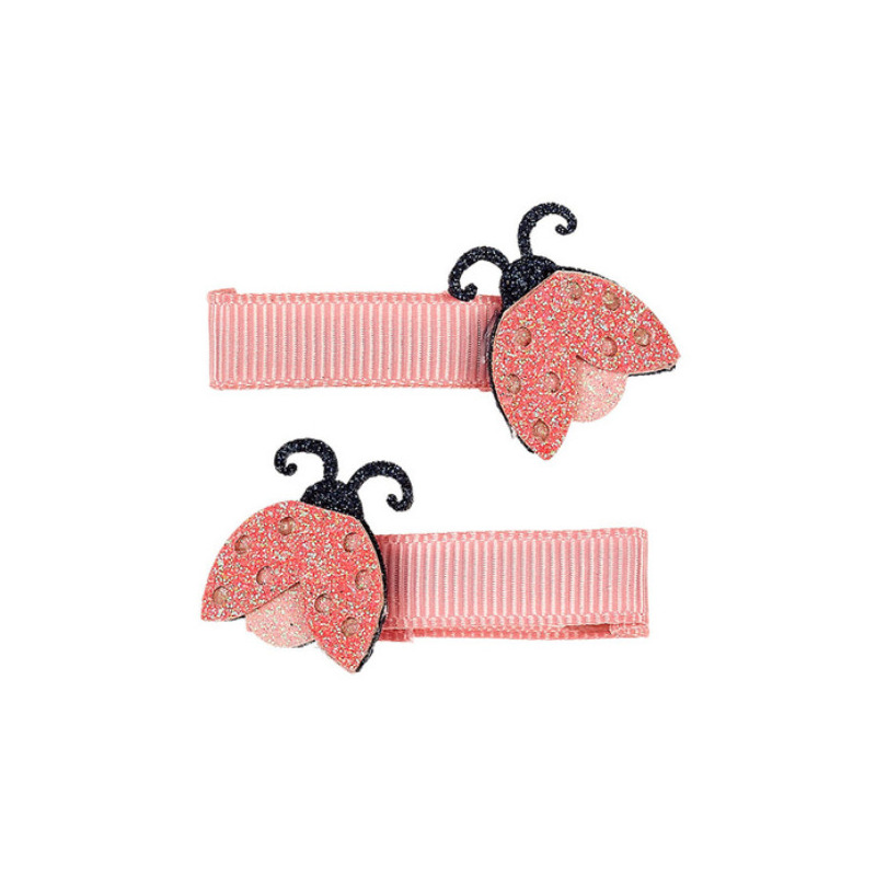 Komplet dwóch spinek do włosów z biedronkami Vere marki Souza! Na każdej z nich znajduje się brokatowa aplikacja – różowa biedroneczka z czarnymi czułkami. Metalowa część spinek pokryta jest jasnoróżowym materiałem (rypsową wstążką).