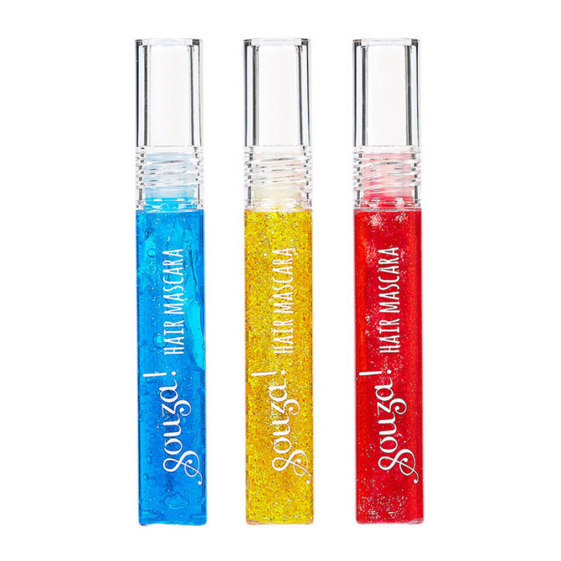 Zestaw trzech brokatowych mascar do włosów dla dzieci holenderskiej marki Souza!. Opakowanie zawiera 8,5 ml kolorowego, brokatowego żelu, którym można barwić pasemka na czerwono, niebiesko lub żółto. Mascary posiadają wygodne szczoteczki, ułatwiające precyzyjną aplikację.