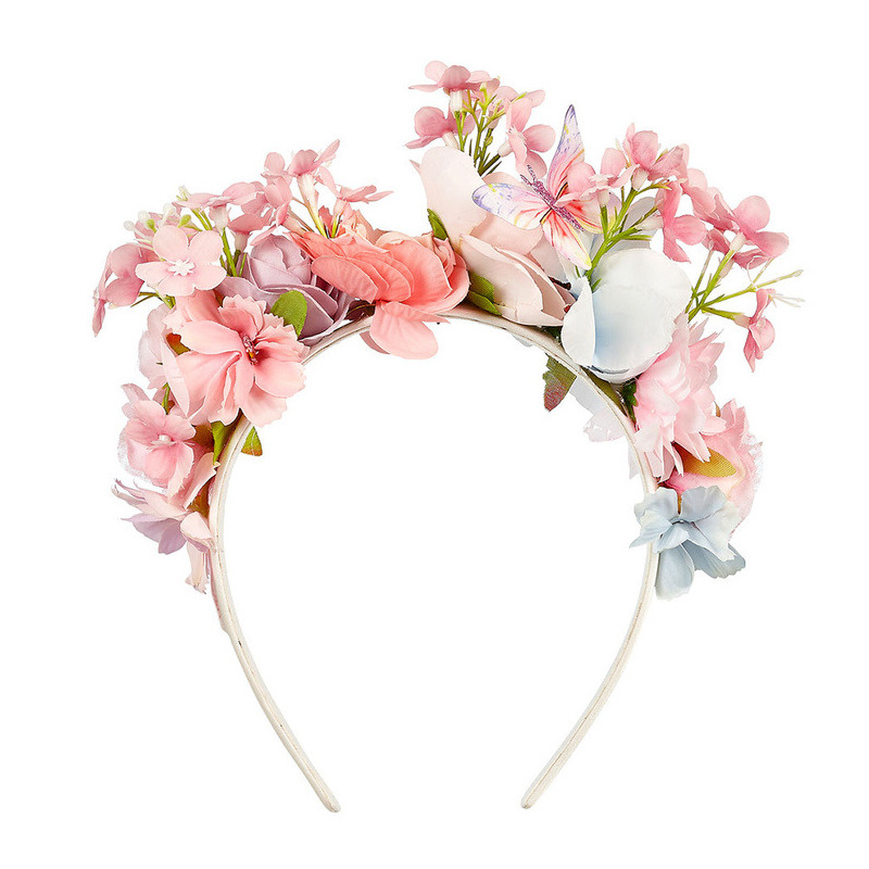 Opaska z łąką Gabi holenderskiej marki Souza! jest przepięknie wykonana, zdobi ją gęsty bukiet kwiatów (dominuje kolor różowy), wśród których znajduje się także motyl z brokatowym korpusem.