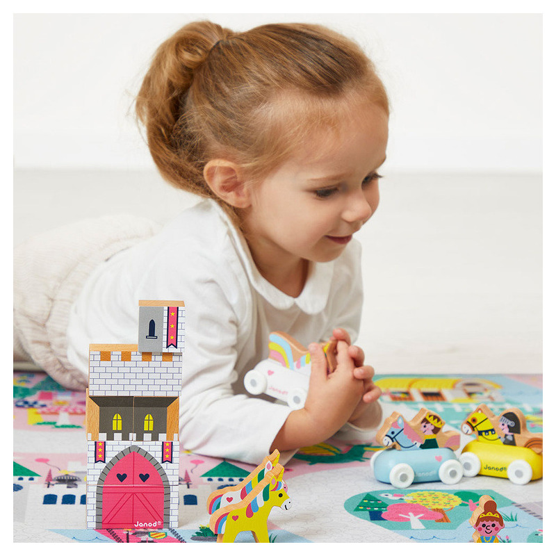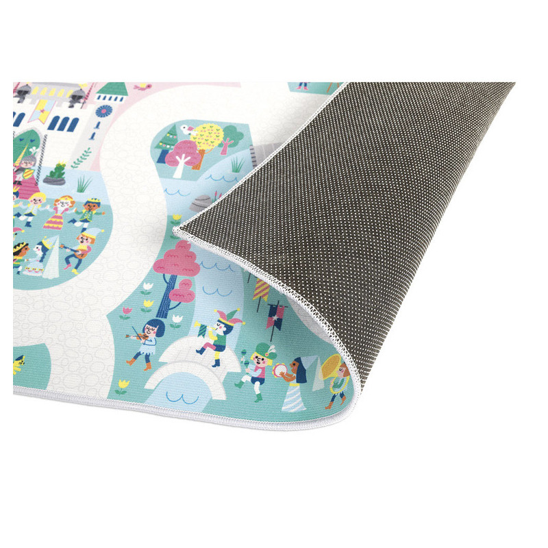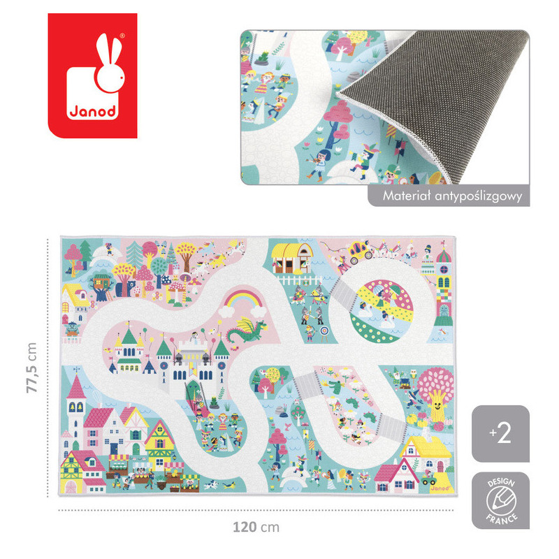 Mata-dywan do zabawy z drogą to idealny prezent dla dzieci już od 2. roku życia. Ma spore rozmiary 120 x 77,5 cm, jest przyjemna w dotyku oraz pozostaje na swoim miejscu, dzięki antypoślizgowej warstwie spodniej. Mata przedstawia bogaty w szczegóły świat bajek i baśni, w którym dziecko może za każdym razem odkrywać coś nowego. Znajdzie w nim różne postacie oraz charakterystyczne dla bajecznego świata miejsca m.in. królewski zamek, wieża czy ogród elfów, a wszystkie punkty łączy sieć dróg. Mata Zaczarowane królestwo zabierze najmłodszych w magiczną podróż pełną baśniowych motywów.