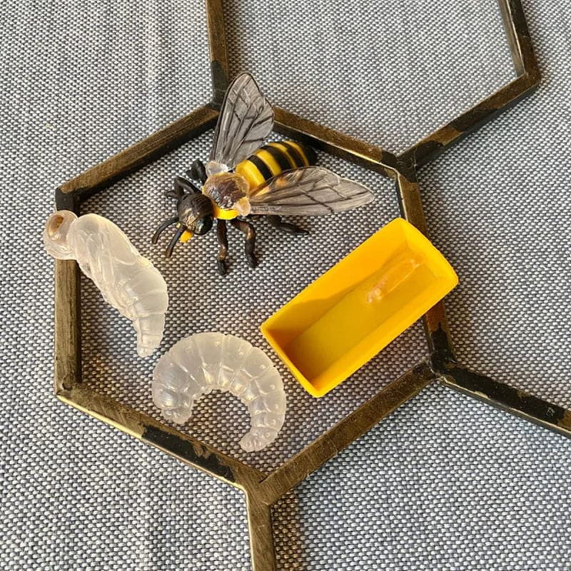 Zestaw 4 figurek cyklu życia pszczoły - jajo, larwa, poczwarka i dorosła pszczoła. Figurki są ręcznie malowane i profesjonalnie wykonane, ukazując realistyczne detale i unikalne cechy poszczególnych etapów rozwoju pszczoły.
