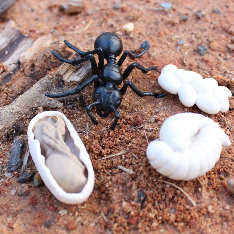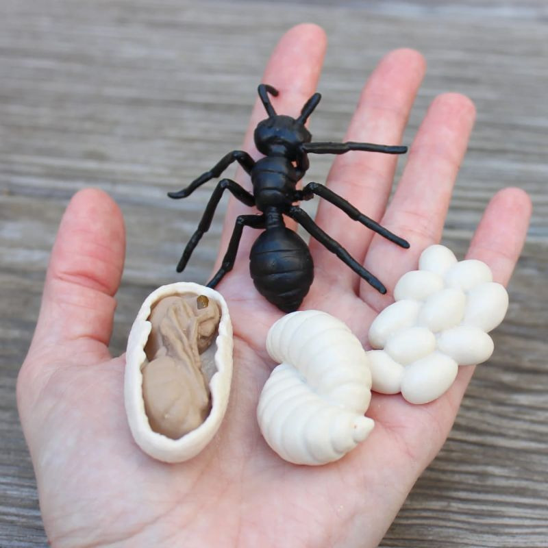 Na wczesnym etapie życia, mrówki nie są zbyt kolorowe, ponieważ większość energii mrówka pochłania na jedzenie. Dopiero dorosłe mrówki mają ubarwienie w kolorach zależnych od gatunku. Figurki z tego zestawu są idealnymi zabawkami Montessori na lekcjach szczegółowo opisujących procesy biologiczne i cykle życiowe owadów. Figurka dorosłej mrówki w tym zestawie ma około 7 cm długości.