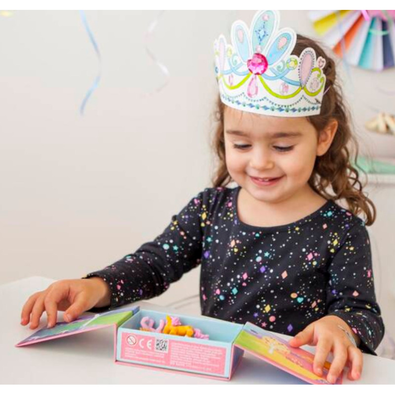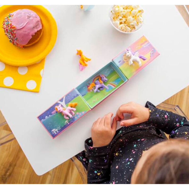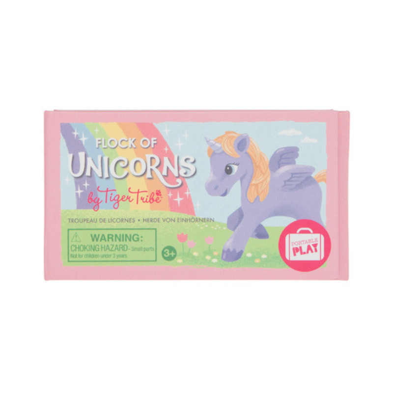 Pudełko pełne zabawy „Stado Jednorożców” od Tiger Tribe to kompaktowy zestaw, który zapewni mnóstwo radości w podróży. Zawiera cztery magiczne mini jednorożce, które można ustawiać na pięknie ilustrowanym tle do zabawy. Każde pudełko po otwarciu zamienia się w miejsce do zabawy i ekspozycji figurek, a po skończonej zabawie można je łatwo schować do zamykającego się magnetycznie pudełka.
