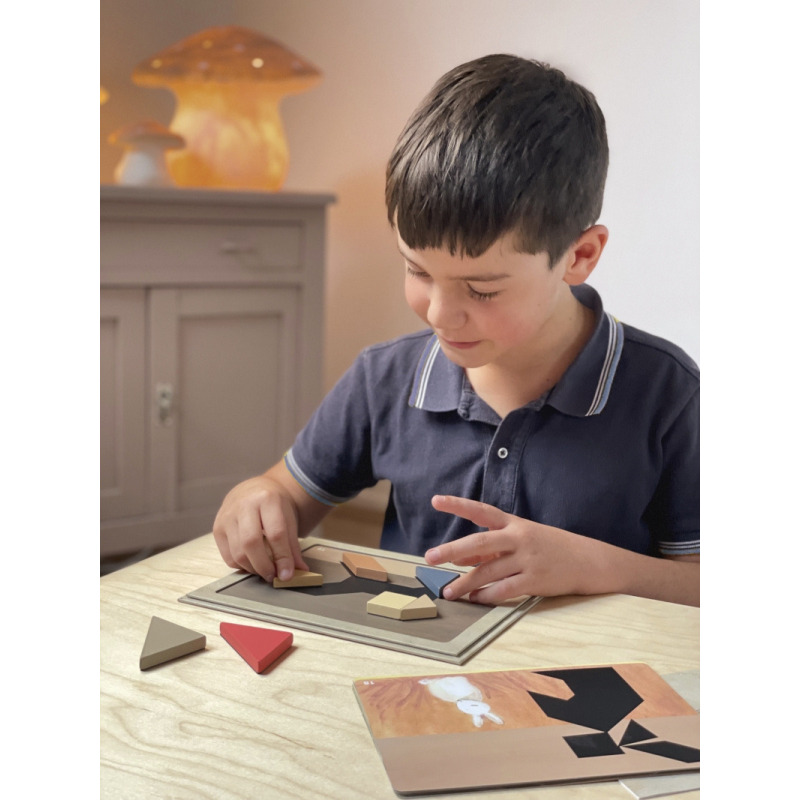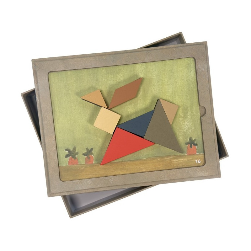 Ta gra to doskonały sposób na rozwijanie zdolności logicznych i przestrzennych! Celem jest odtworzenie 30 różnych wzorów na czarnych kształtach za pomocą drewnianych elementów tangramu.