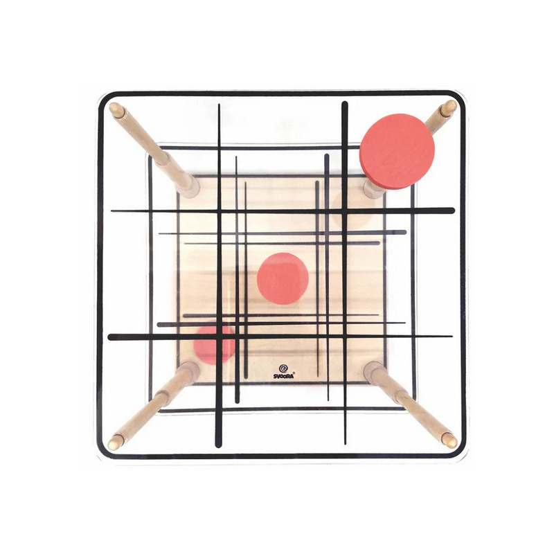 GRA SKŁADA SIĘ Z: drewnianej podstawy, 2 akrylowych tablic, 4 drewnianych prętów do połączenia plansz oraz pionków: 13 czerwonych kółek i 13 niebieskich krzyżyków.