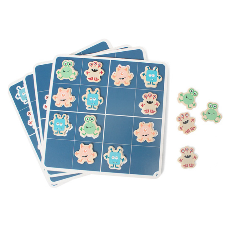 Drewniane Sudoku "Potworki" to rewelacyjna gra logiczno - pamięciowa stworzona na wzór prawdziwego Sudoku. Pola na kartach należy wypełnić różnokolorowymi potworkami tak, aby żaden kolor nie powtarzał się w rzędzie, kolumnie lub kwadracie.
