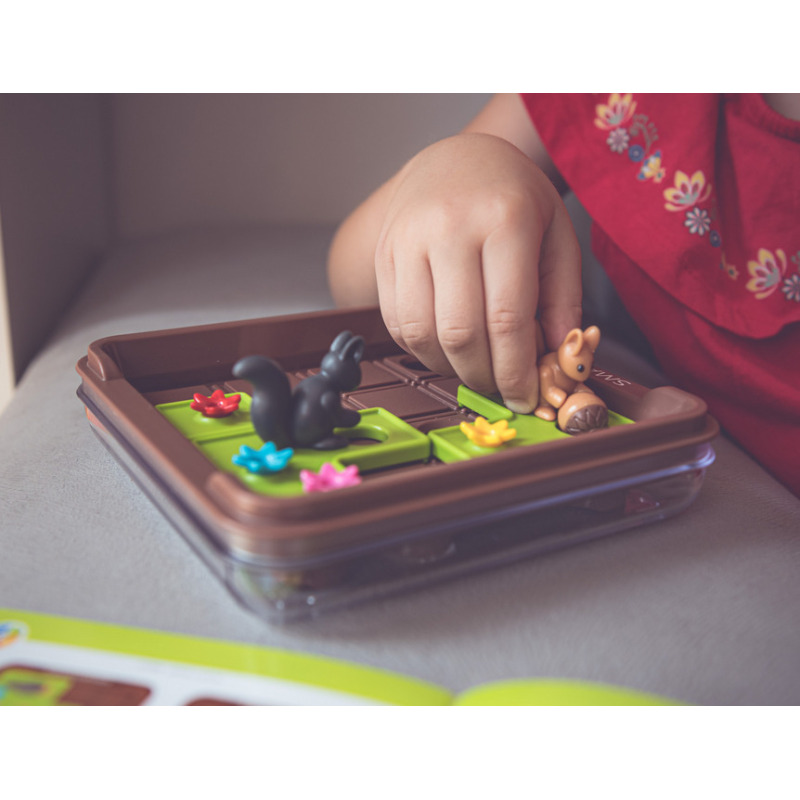 - 5 orzechów oraz 5 elementów do ułożenia, na których znajdują się wiewiórki oraz leśne rośliny.
