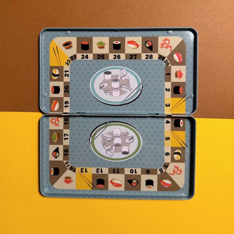 maki, nigiri, sashimi, gunkan, temaki, fotomaki, sosu i pałeczek. Zwycięża ten, kto jako pierwszy zapełni swoją tacę i zawoła „Bingo!”.
